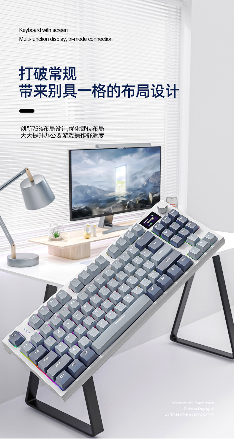 [Smart TFT Color Display and Knob design] The 86 Gaming keyboard has built-in smart TFT color display that visually displays the keyboard status, including custom GIF images, connection mode, WIN/MAC, battery level, date and time. CNC metal knobs quickly adjust connection mode, backlight effect/color/brightness speed, volume, language, and more. There is no doubt that mini displays will take keyboard customisability to a new level.
