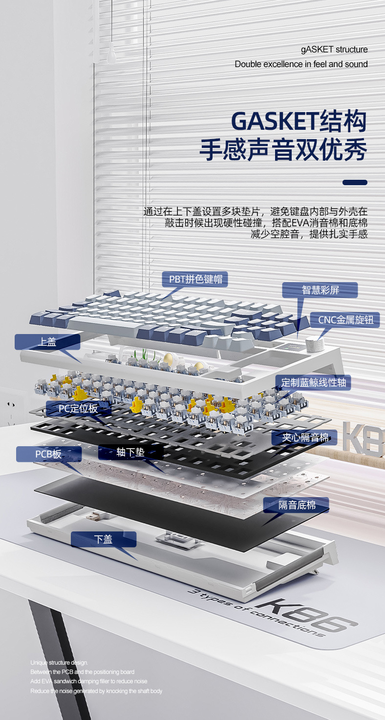 [Gasket mounting and triple absorption foam] The K86 uses a gasket mounting system, which is a sought-after design in the mechanical keyboard world. In order to better adapt to gasket installation, the K86 has a PC board that is more resilient than ordinary steel plates. The keyboard comes with washers, EVA PCB foam and bottom foam, plus IXPE switch pads for a pleasant typing sound. You can actually feel the "THOCKY" sound in every corner of this keyboard!