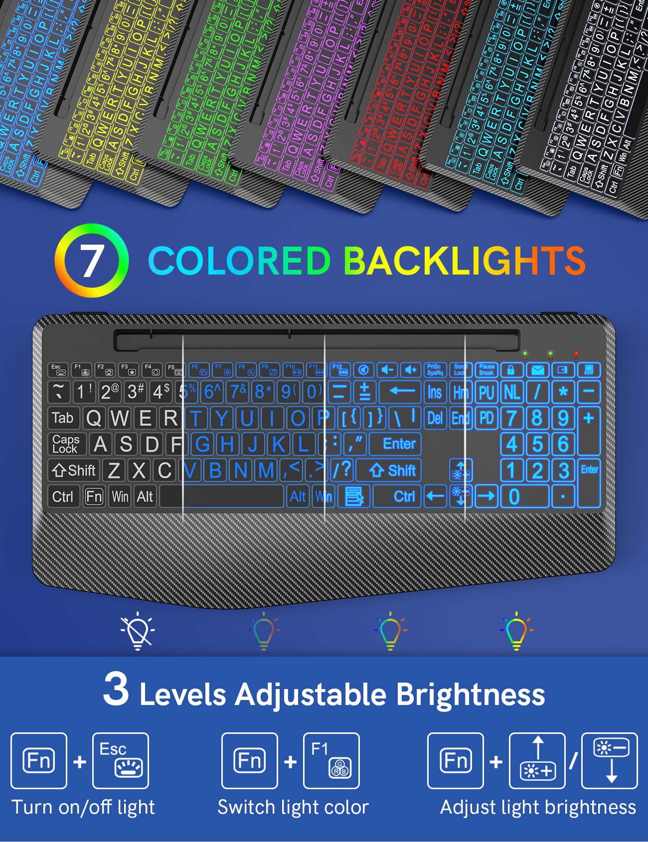 - 【7 Switchable Colors Backlight 】The ergonomic wireless keyboard comes with 7 switchable backlights and 3 brightness levels to provide you with a different visual typing atmosphere. Choose your favorite keyboard setting and take your desk setup to the next level. The keys will be clearer under the backlight, too. Let you work effortlessly in the dark typing.