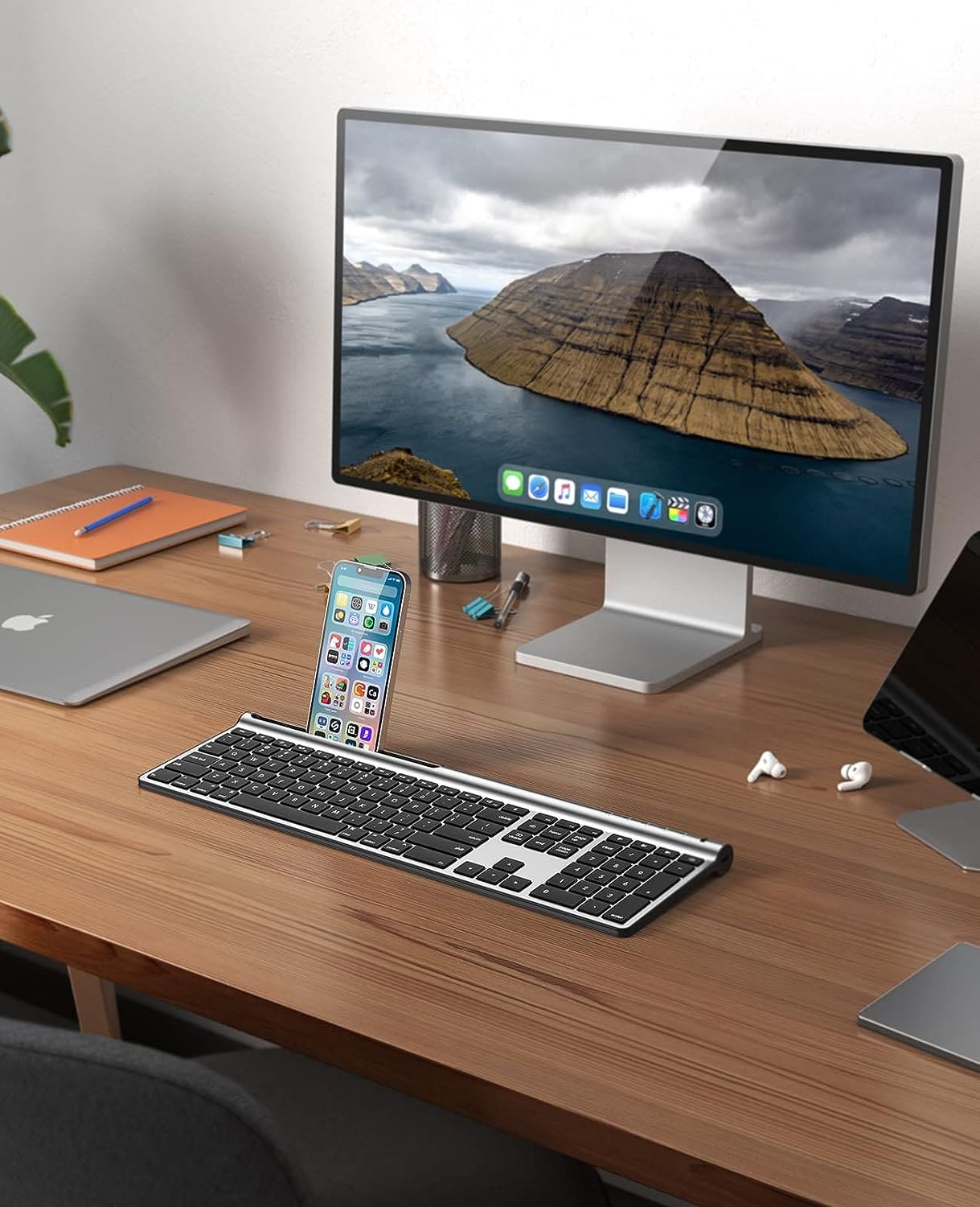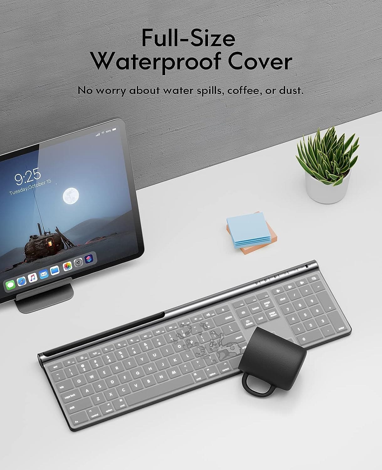 - ⌘ Responsive & Ultra-Slim Design: Made of ABS, silicone, galvanized sheet, this wireless mac keyboard is ultra-slim and easy to use. Scissor switch keys are quiet and responsive, perfectly suitable for home office, studying, remote working. A waterproof silicone membrane attached can effectively avoid accidental liquid spills, such as coffee, juice, milk.