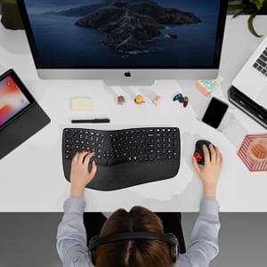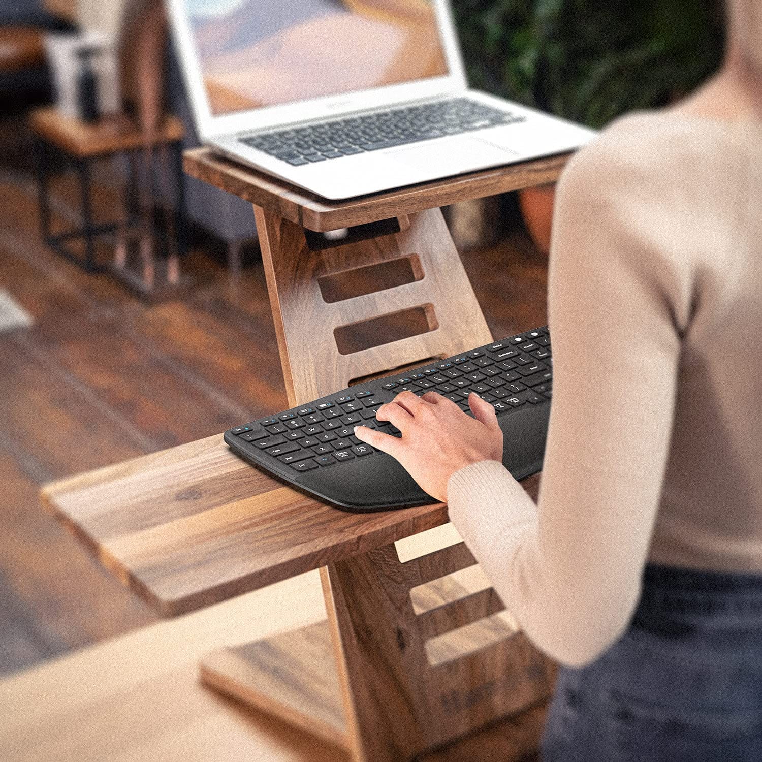 Ergonomic keyboard separate the standard keyboard layout into two halves, split the keys in half roughly around the center of the keyboard, slightly tilt each half in a way to offer a more natural hand wrist position and reduce muscle strain while typing.