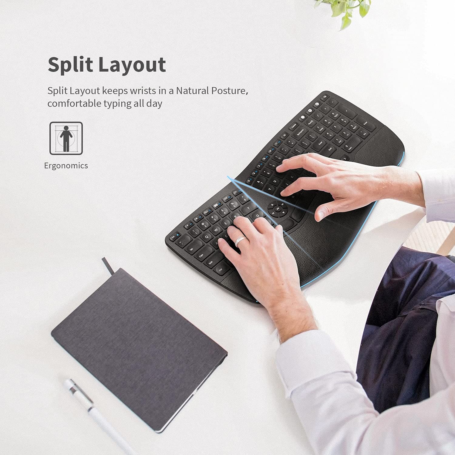 - 【Ergonomic Keyboard for Natural Typing】 With curved, split keyboard design, this keyboard help reduce muscle strain on your forearms and wrist, improve your typing posture, best care of your arms and wrist. Natural typing, comfortably working.