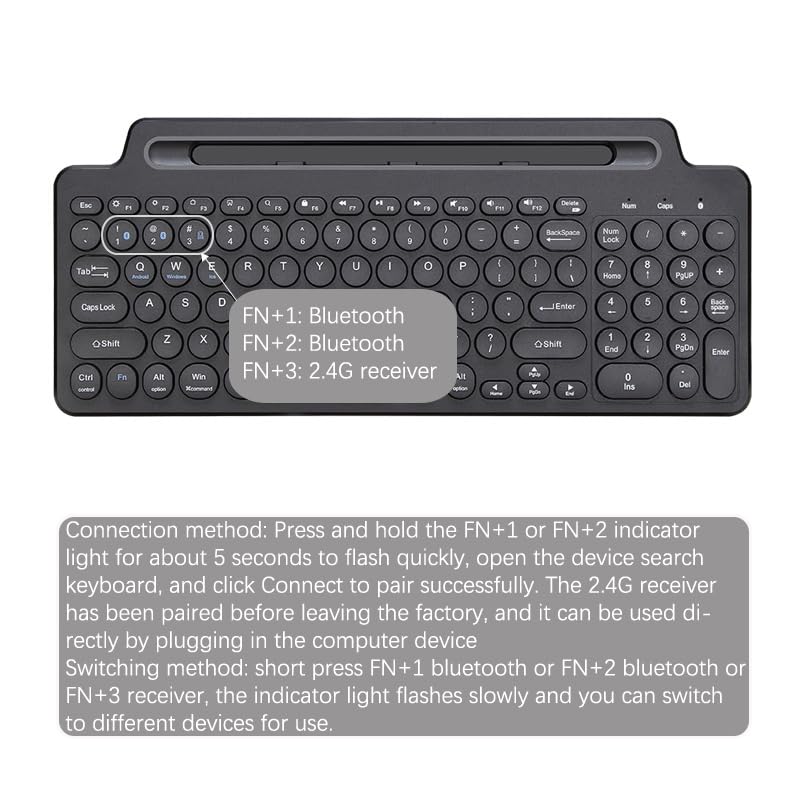 Connection method: Press and hold the FN+1 or FN+2 indicatorlight for about 5 seconds to flash quickly, open the device searchkeyboard, and click Connect to pair successfully. The 2.4G receiverhas been paired before leaving the factory, and it can be used di.rectly by plugging in the computer deviceSwitching method: short press FN+1 bluetooth or FN+2 bluetooth orFN+3 receiver, the indicator light flashes slowly and you can switchto different devices for use.
