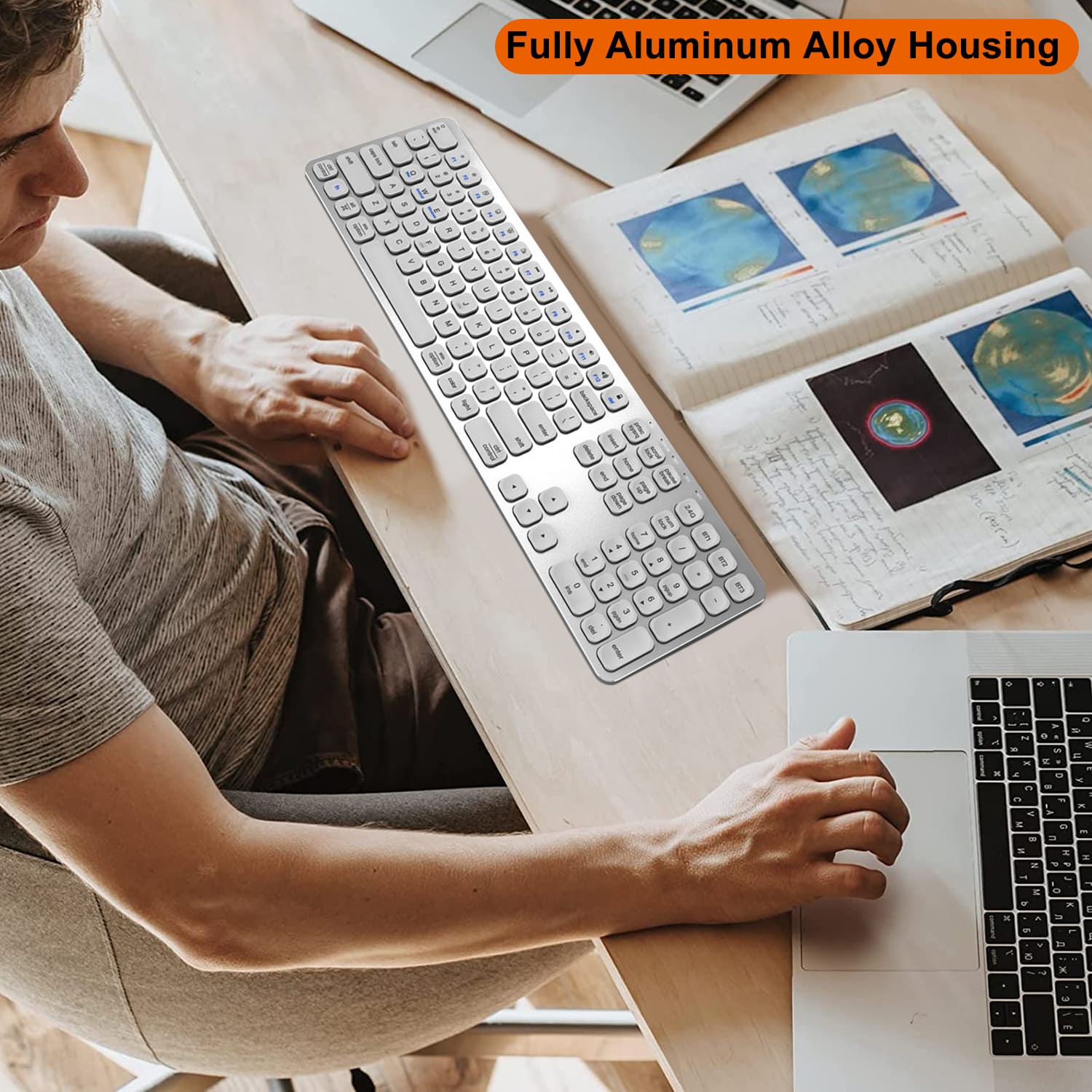 - [ Wireless Illuminated Keyboard ] - The white backlight on the lighted keyboard is bright and evenly distributed, without glare, less light pollution than colorful backlit, protecting your eyes, and more convenient to type in low-light environments. Ideal for studio work, office and home. Adjustable 3-level brightness: low-mid-high to suit all your needs. The backlit can be turned on and off