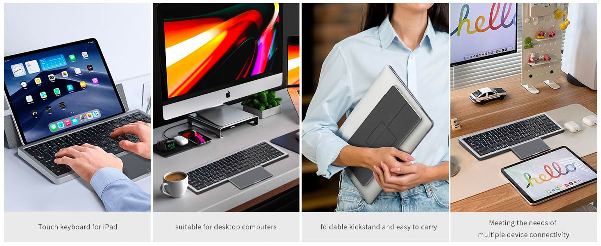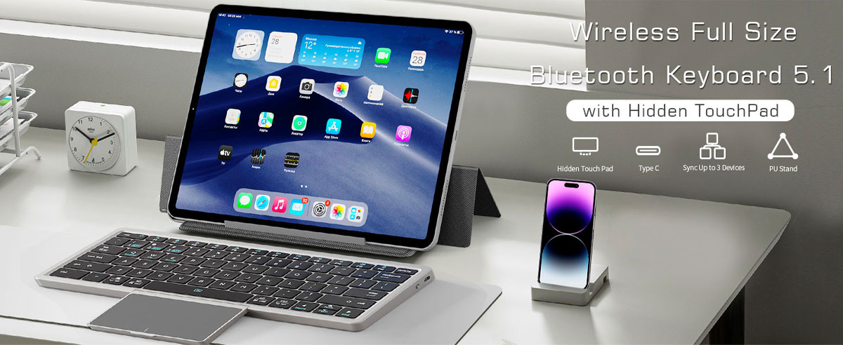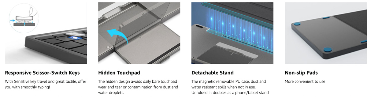 - Full Size Bluetooth Keyboard: Featuring a full-size with a hidden touchpad. The hidden design avoids daily bare touchpad wear and tear or contamination from dust and water droplets. The scissor key makes typing more comfortable, quiet, and precise.