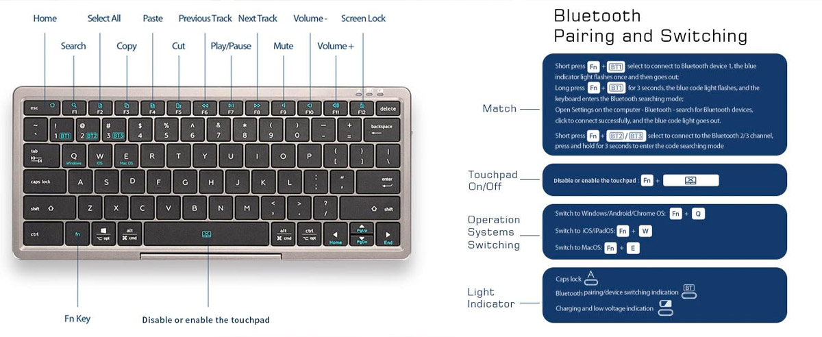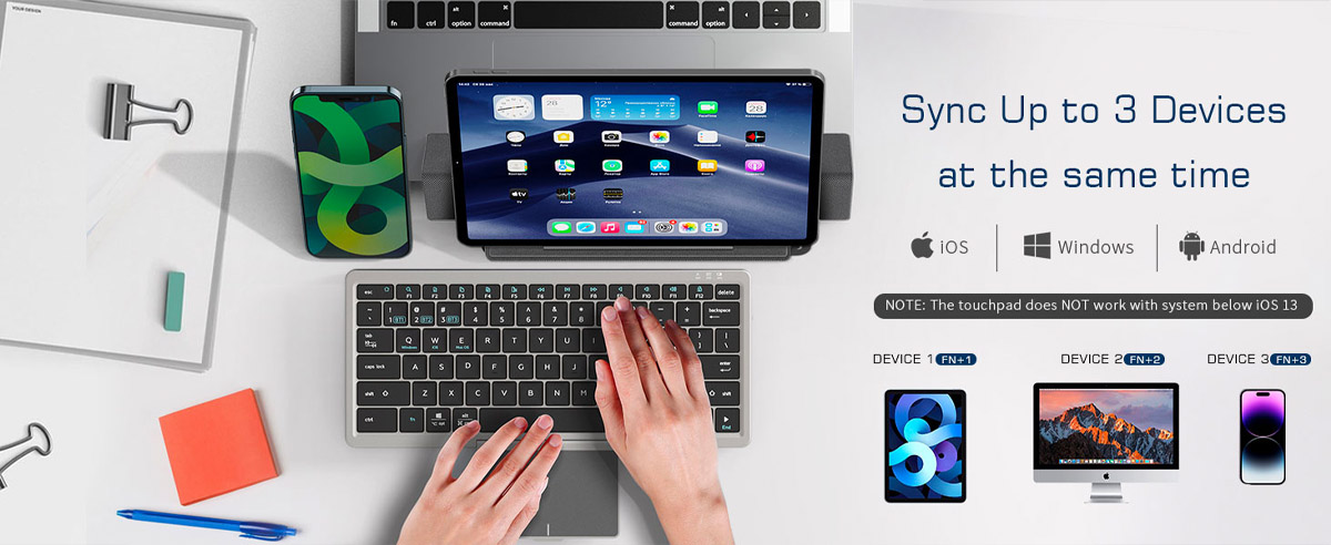 - Sync Up to 3 Devices: The Bluetooth keyboard works seamlessly with Windows iOS Android and Mac. Allow to connect and instantly switch between up to 3 devices at the tap of a hotkey. Maintain a stable connection and provides fast response to devices within 33ft. The keyboard will automatically remember and reconnect to the last devices used when powered on (NOTE: The touchpad does NOT work with system below iOS 13 )