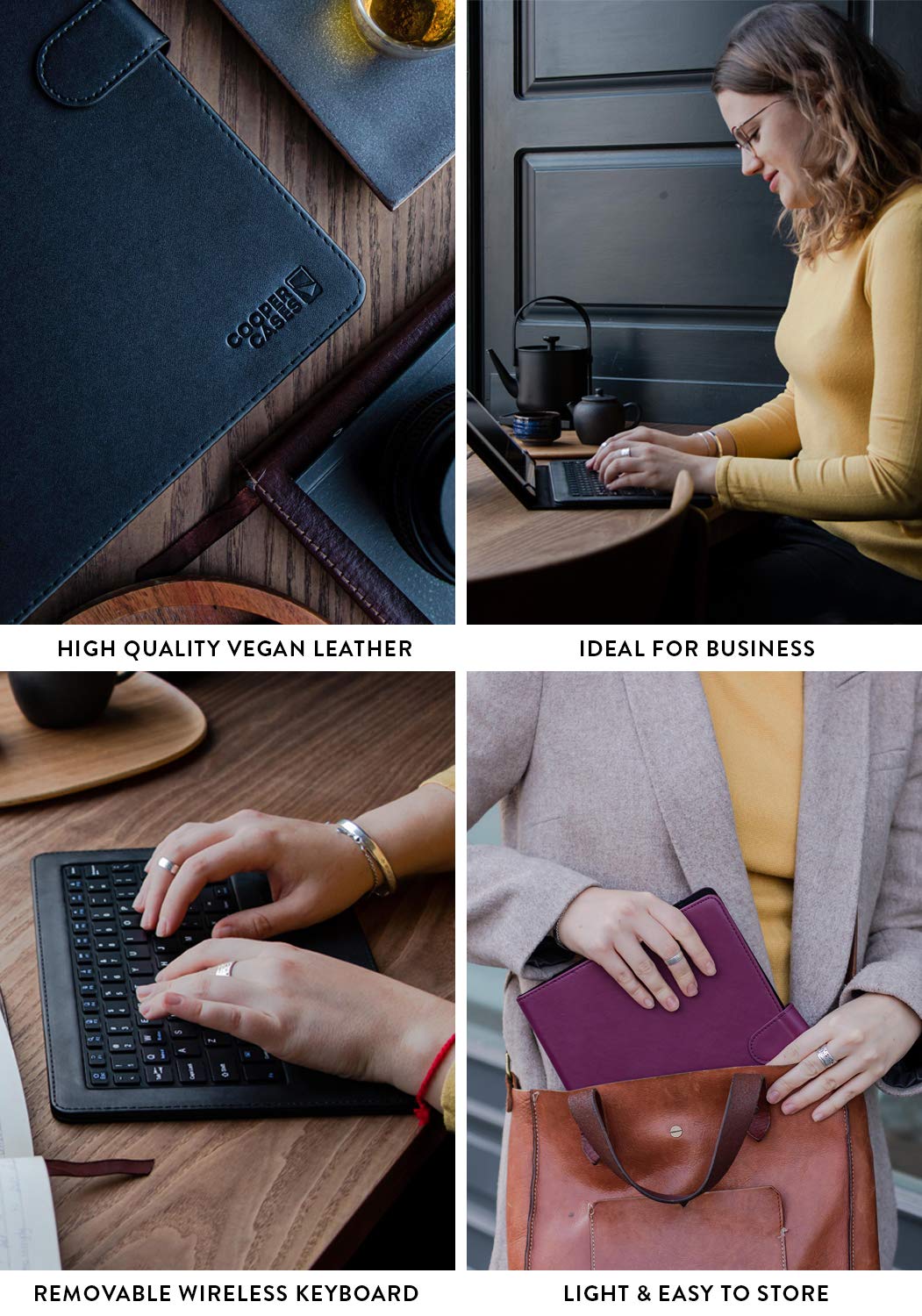 - 2-in-1 Leather Folio Case with Keyboard: Premium protective vegan leather tablet case with kickstand; improves typing speed & efficiency with magnetic, removable full-sized keyboard; soft microfiber interior